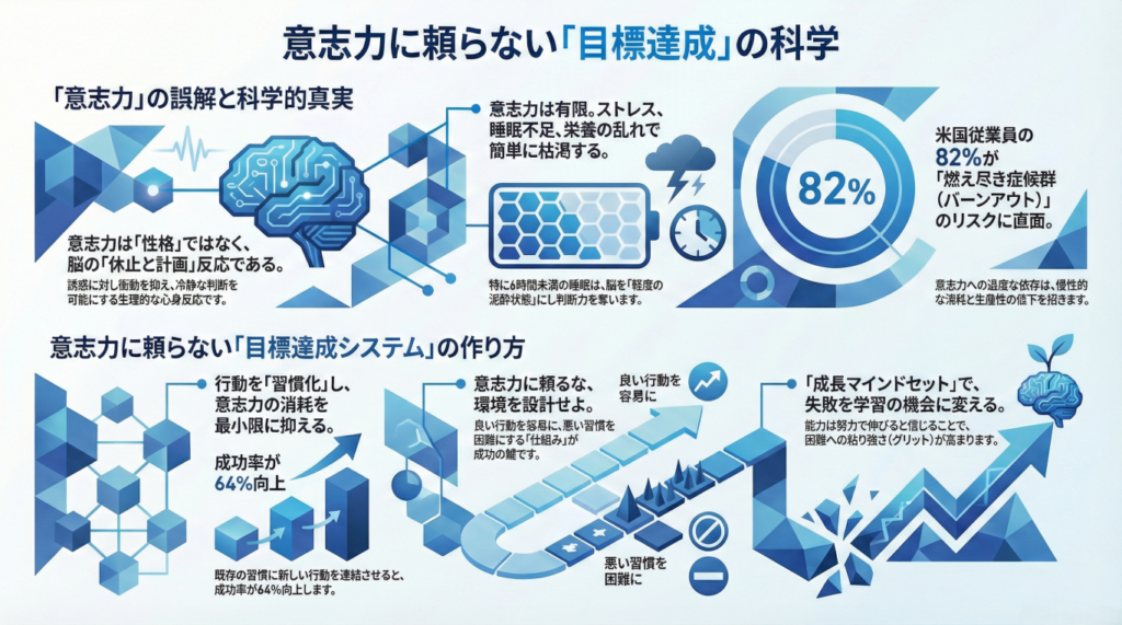 しかし、最新の科学研究は、私たちが意志力について抱いている常識が、実は多くの誤解に基づいていることを示しています。意志力は、精神論ではなく、私たちの脳と身体が起こす具体的な反応であり、そのメカニズムを理解すれば、誰でも管理し、強化することができるのです。