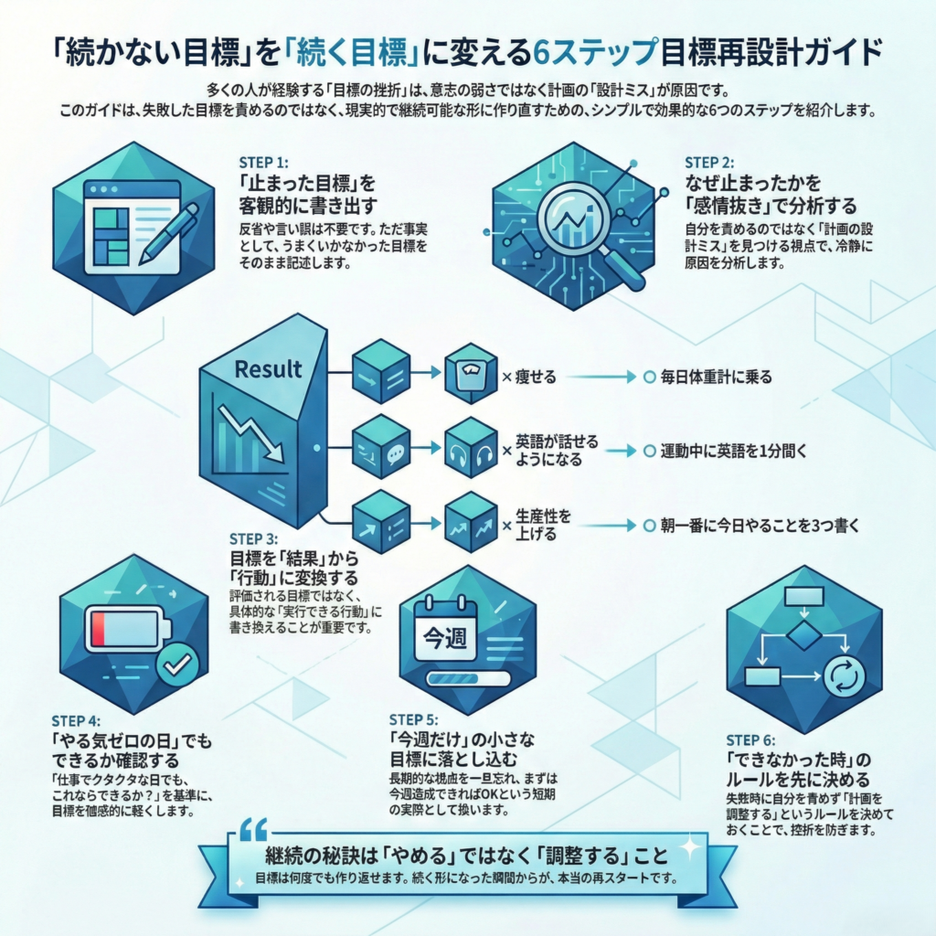そんな状態でも続けられる設計になっていなければ、目標は自然と止まります。これは意志の問題ではなく、設計の問題です。
